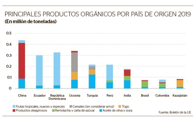 De acuerdo con la Comisión Europea, en 2019 entraron en la Unión Europea 3.24 millones de toneladas de productos orgánicos, 0.4% más que en 2018; y los diez mayores proveedores fueron China, Ecuador, República Dominicana, Ucrania, Turquía, Perú, India, Brasil, Colombia y Kazajistán. En 2019, Perú exportó a Europa 214.240 toneladas de productos orgánicos,