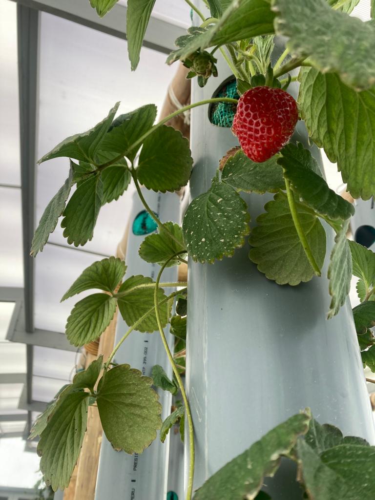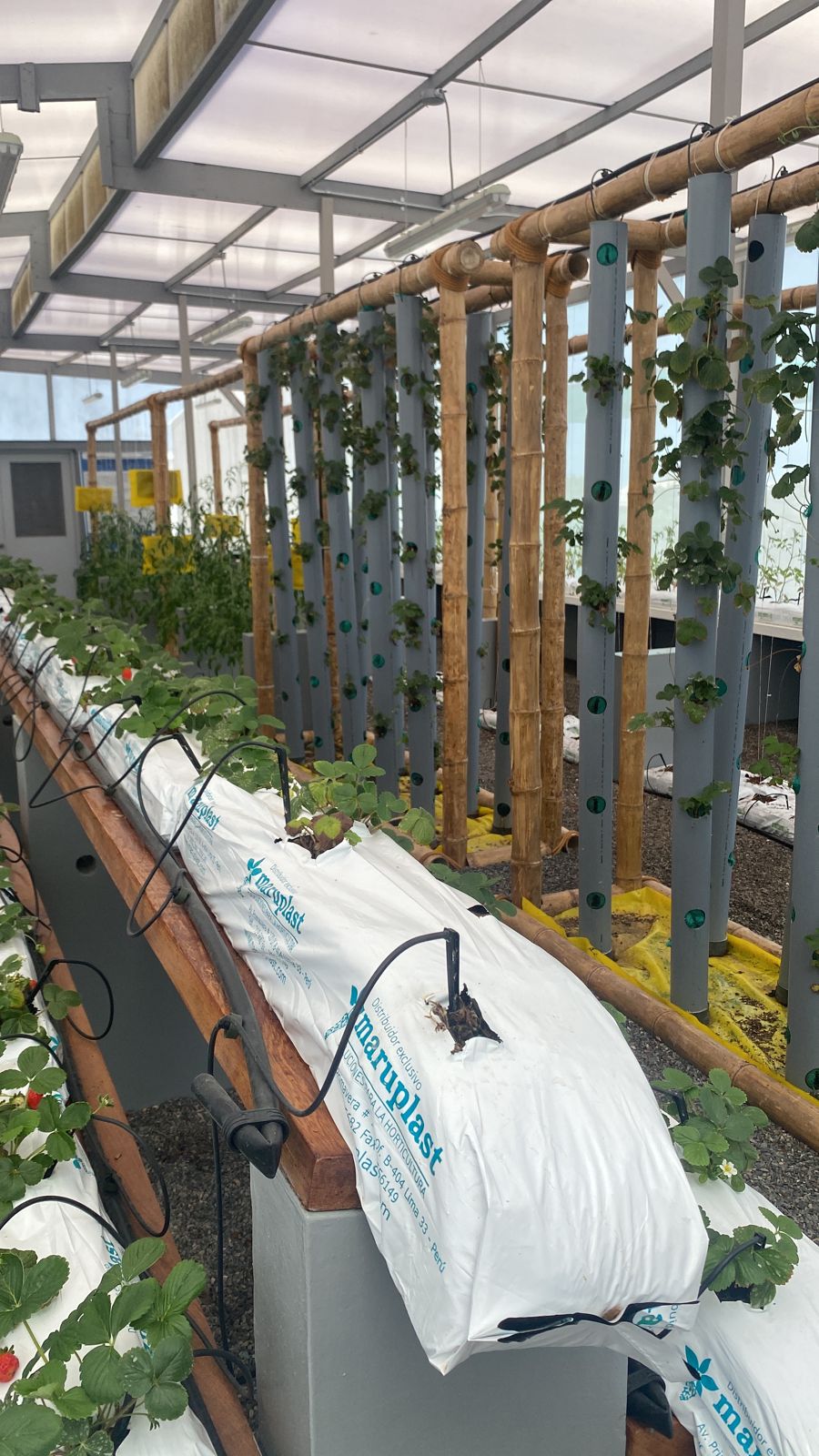 Quirós explica que una produccion convencional de fresas en suelo se da con seis plantas por metro lineal, en tanto que en el sistema hidropónico tradicional se puede tener 20 plantas en el mismo espacio. Pero en el sistema vertical, como el que usa la UCS, ingresan hasta 60 plantas, triplicando la producción en el mismo espacio.