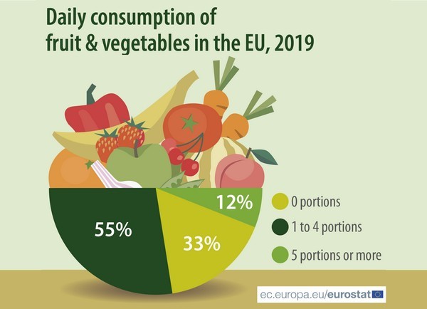 (Agraria.pe) En 2019, 1 de cada 3 personas en la Unión Europea (UE) decía no consumir ninguna fruta u hortaliza a diario. Tan solo el 12% de la población consumía las cinco porciones recomendadas o más a diario.