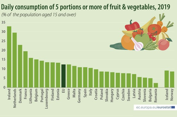 La mayor ingesta diaria –5 porciones o más– en los Estados miembros se informó en Irlanda (33% de la producción), Países Bajos (30%), Dinamarca (23%) y Francia (20%).