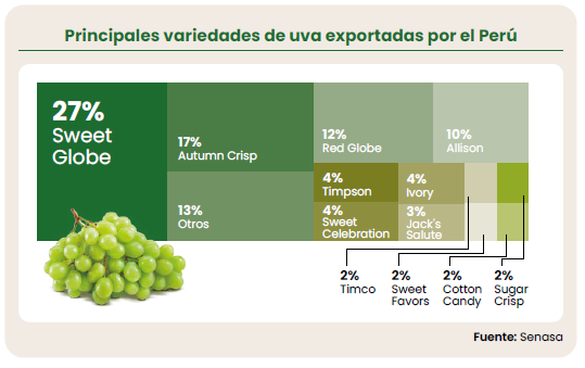 En este contexto, la diversificación varietal se ha convertido en la mayor fortaleza de la uva peruana. El país ha evolucionado de un modelo dependiente de variedades tradicionales hacia otro basado en innovación genética. Actualmente, cultiva más de 60 variedades, aunque la exportación se concentra en aquellas con mayor demanda. El cambio más notable es el predominio de las uvas sin semilla, que ya representan cerca del 75% exportado.