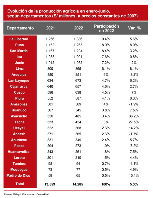 La Libertad concentró la mayor producción agrícola, con S/ 1.336 millones (+5.6% respecto a 2021), concentrando el 9.4% del total. Le sigue Puno, con S/ 1.265 millones (+8.9%), participando con el 8.9% del total; San Martín con S/ 1.204 millones (+3.2%), que representó el 8.4% del total.