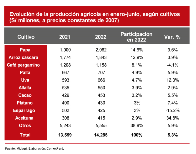En relación con los cultivos, destacó la papa, con un valor de producción de S/ 2.082 millones durante la primera mitad del 2022, lo cual significó un incremento del 9.6% con respecto al resultado del mismo periodo de 2021. El arroz se posicionó en segundo lugar, con S/ 1.843 millones (+3.9%), participando con el 12.9% del total; seguido por el café pergamino, con S/ 1.158 millones (-4.1%), que representó el 8.1% del total.