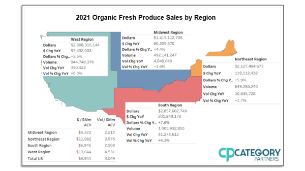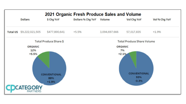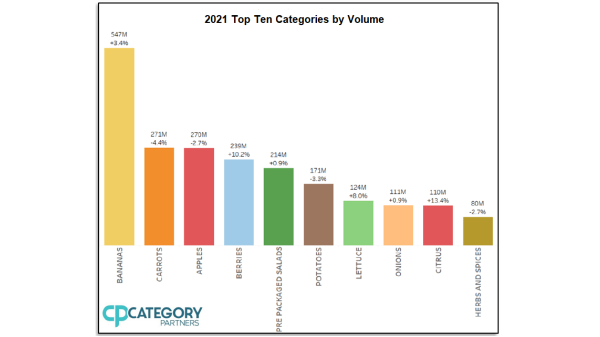 Tres categorías (berries, sandías y cítricos) impulsaron aumentos en el volumen orgánico total en 2021. Varias categorías orgánicas poderosas tuvieron disminuciones de volumen año tras año, incluidas las ensaladas envasadas, las papas y las zanahorias. Las zanahorias orgánicas experimentaron una disminución del volumen de -4.4%, y fueron la única categoría de ventas de productos orgánicos del top 10 que experimentó una disminución de ventas (-1.3%) desde 2020.