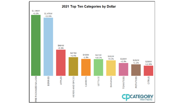 Tres categorías (ensaladas envasadas, berries y manzanas) representaron dos tercios de todo el crecimiento en dólares frescos orgánicos en 2021 en comparación con 2020. A pesar del gran aumento en dólares año tras año de los berries orgánicos, las ensaladas envasadas fueron nuevamente el número uno en la categoría de productos por ventas totales, superando los US$ 1.500 millones.