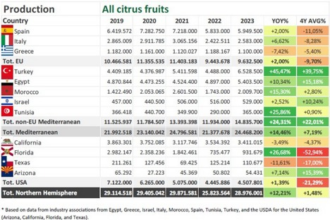 La previsión se basa en datos de Egipto, Grecia, Israel, Italia, Marruecos, España, Túnez, Turquía y Estados Unidos. Se prevé que la producción de cítricos alcance las 28.976.001 toneladas, lo que representa un aumento de +12.2% en comparación con la anterior temporada alta. La previsión 2023/2024 es un +1.48% superior a la media de las cuatro últimas temporadas.