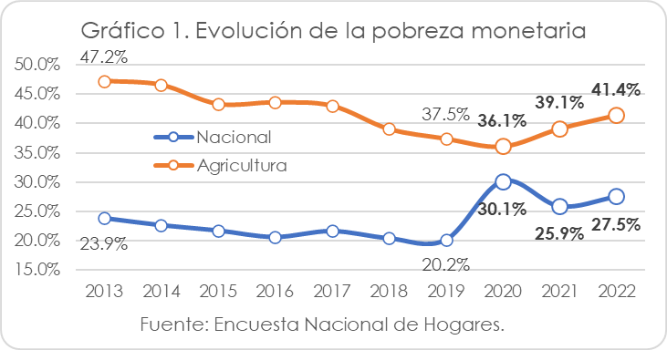 Bajo este escenario crítico, la agricultura del país, sin embargo, mal que bien, ha podido responder a las demandas alimentarias de toda la población, a pesar de estar doblemente golpeada, de un lado, por las presiones inflacionarias y, de otro lado, por el encarecimiento de sus principales insumos agrícolas (urea y otros fertilizantes químicos) que son de uso extensivo en el país. Este año se ha sumado un tercer impacto negativo: el de los fenómenos climáticos recientes (inundaciones, desbordes, huaicos) que supusieron pérdidas de sembríos en varias zonas productoras del país. Con tantos golpes consecutivos a la agricultura, resulta necesaria la intervención estatal, así como la aplicación de políticas que permitan su recuperación económica. Para entender la magnitud del problema, repasemos cuál es la situación actual de pobreza en la agricultura[1] y cómo esta ha venido evolucionando.