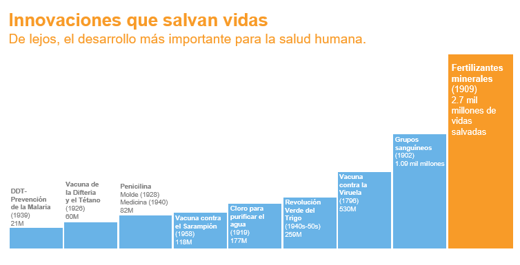 Según un estudio de la universidad de Yale, los fertilizantes minerales son la innovación que más vidas ha salvado en la historia de la humanidad gracias a que producen más la mitad de la comida, para personas y animales, en el mundo.