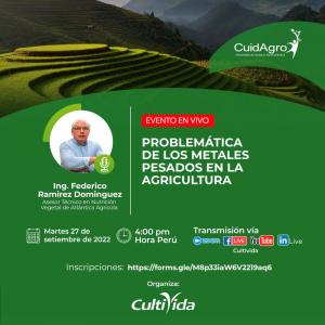(Agraria.pe) La asociación CultiVida organiza el Webinar: “Problemática de los metales pesados en la agricultura”, que se realizará el 27 de setiembre a las 4:00 pm y tendrá como expositor al Ing. Federico Ramírez Domínguez, Asesor Técnico en Nutrición Vegetal de Atlántica Agrícola.